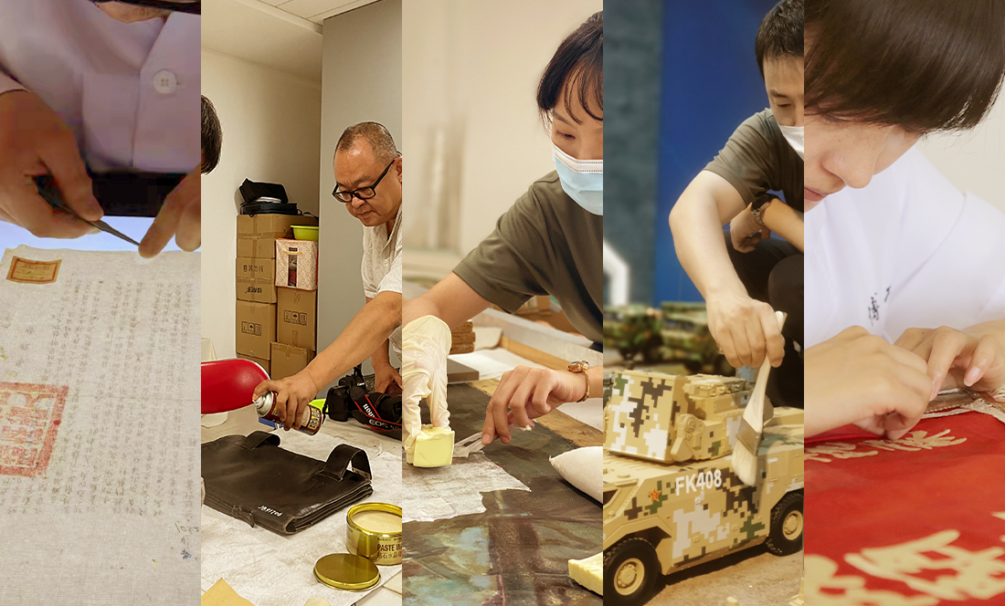 结合馆藏特点和科学保护需要,军博于2018年增设文物保护部门,分设纸质、纺织品、器物、轻武器、油画类文物修复工作室,以及文物保护实验室和消毒室,围绕军博馆藏文物长期保管、抢救性保护、日常维护、安全展陈、重大展览修复保护等业务需求,开展预防性保护、修复、复制、文保学术研究等工作,形成“伴随重大展览修复、保护性展示、日常保护性巡查”等文物保护理念和实践,构建了一套严密完整、军事特色鲜明、科学理念突出的文物保护体系。